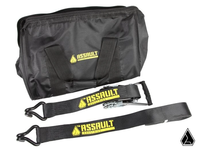 Each of the 4, 16ft (4.8m) long included straps have a 3,300lbs (1497kg) working load and a 10,000lbs (4536kg) breakpoint. Each strap kit comes with an Assault Industries storage bag to keep your gear neat and tidy. Assault Industries branding is printed on the black straps and bag. Secure your stuff with the best!