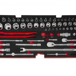 Each tool is encased in an EVA foam tool storage solution tray making tools fit securely in drawers to keep organized and no shifting during motion. The mirror chrome finish on the tools protects the toolset against corrosion, cleans up easily and looks great too. Included are 1/4″ & 3/8″ 90-tooth ratchets, extensions, and 6-point sockets. Our wrenches in this set feature smooth jaw open ends, 12-point box ends with positive grip and 15° offset which provides clearance and ease of use during tight applications. Each wrench is marked with the size on both sides to quickly identify the size you need. The screwdrivers and pliers are equipped with ergonomic handles for comfort and provide extra grip during use.