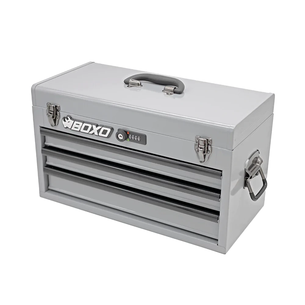 The heavy-duty 20 gauge steel hand carry toolbox features; ball-bearing drawer slides allowing for ease of use, smooth-latch locking drawers, three sturdy and comfortable handles, and a key lock and digit-lock resettable combination lock system to keep your tools secure.