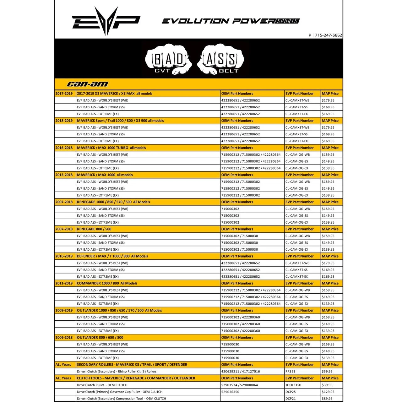 Are you looking for a superior and in many cases a less expensive alternative to costly OEM CVT belts? EVP has worked directly with GBoost Technology, the authority in advanced CVT belt design and manufacturing on a wide variety of CVT belts for Can-Am applications. We have extensively tested and validated each belt in the most grueling race environments to ensure the strength and durability of each application. Each different compound was subjected to an extensive durability regiment through our sponsored desert racer program and on our own big horsepower vehicles. The “BAD ASS” line of drive belts have proven themselves in extreme conditions which allows customers and racers peace of mind while pushing their vehicles to the limits without the fear of premature belt failure. Along with increased strength and durability, the three different BAD ASS belt compounds provide better grip which transfers more power to the ground. These belts are BAD ASS!
