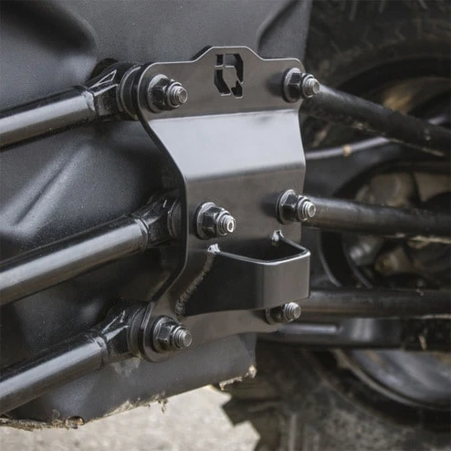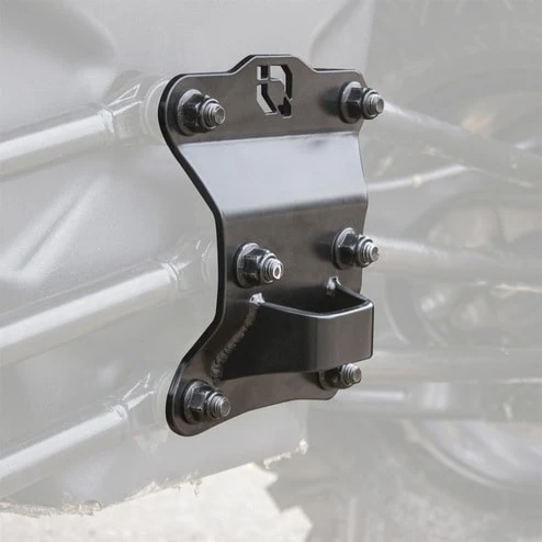 The HMF IQ Pull Plate for the Can-Am Maverick X3 is designed to add strength and rigidity to the Rear Frame and Mounting Points of the Radius Rods. Powdercoated black, the plate is built from 3/16″ thick steel with the pull hook from 1/4″ thick steel. The steel hook gives the ability to pull from the rear and supplies a good tie-down point when trailering. The plate is easy to install utilizing the stock hardware