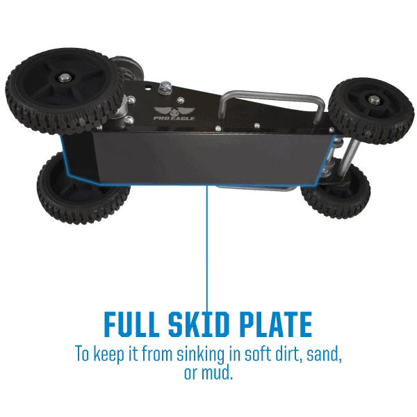 Based on our 2 ton jack platform, we have added strong solid axles and large non-pneumatic wheels to give our jack a lift. No longer will you have to worry about dragging your jack through the sand or not being able to run over a zip tie or pebble in the garage. We worked hard to create the ultimate Off Road Jack that would hold up to the toughest off road racing conditions. 29″L 13″W 6″ min height W/O 8″ ext. All Pro eagle jacks come with an extension. extension mounting bracket and built in skidplate. Full extended height is 2’2″ with the supplied 8″ extension.