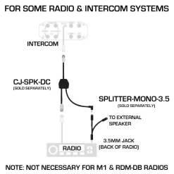 When using this external speaker connected to some older intercom and radio systems, please note the following. To make sure radio traffic is also heard in your headset or helmet kit, you must use both the CJ-SPK-DC and SPLITTER-MONO-3.5. Together, these will disable the radio speaker while passing the signal to both the external speaker and into your intercom.