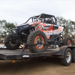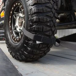 SpeedStraps Innovative UTV Tire-Bonnets keeps your vehicle secure on the trailer. Each bonnet wraps around and over the vehicles tire, to keep the wheel grounded to the trailer. Unlike other tire-bonnets that can only fit a certain size tire, SpeedStrap’s Tire Bonnets have an innovative design that sucks in against the tire when pulled tight. The top strap has 3 size slots, so it can adjust to fit approx 26”-36” size tires. On most trailers, its rare to have anchor points that are set perfectly on either side of the tires (unless you have E-Track). So we made the front strap of our tire bonnet adjustable and with extra length, so that you can reach more anchor points on your trailer.