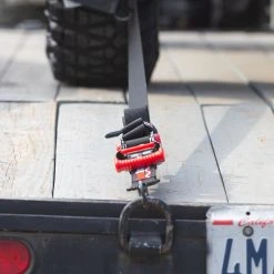 These straps are another great way to lock the wheels down to the trailer. Simply take the strap end of the tie-down and run it through the wheel, then feed it through the D-Ring, and then back into the ratchet barrel. Pull tight and ratchet the tire down tight to your trailer. The tie-down creates a loop that tightens against the wheel, and can fit pretty much any size tire. Since you’re only running the strap webbing through the wheel, it can work with almost any style of spokes (unlike a metal hook which may not fit, or can scratch your wheel).